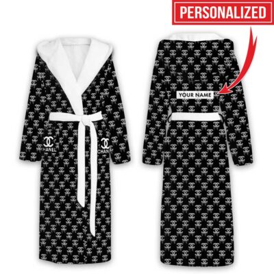 Chanel Black Logo Pattern Luxury Unisex Flannel Hooded Bathrobe