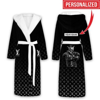Louis Vuitton Black Pattern Travis Scott Luxury Unisex Flannel Hooded Bathrobe