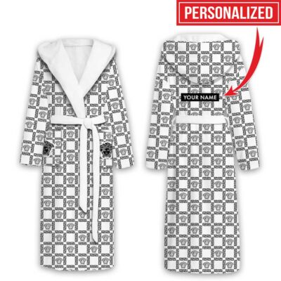Versace White Logo Pattern Luxury Unisex Flannel Hooded Bathrobe