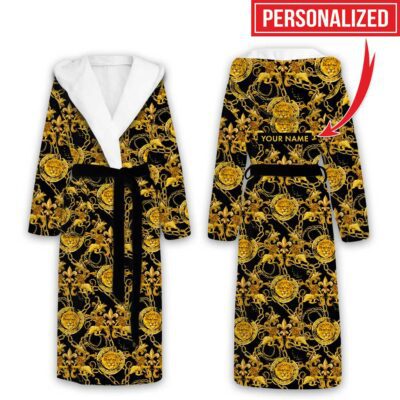 Versace Black Gold Lions Pattern Luxury Unisex Flannel Hooded Bathrobe