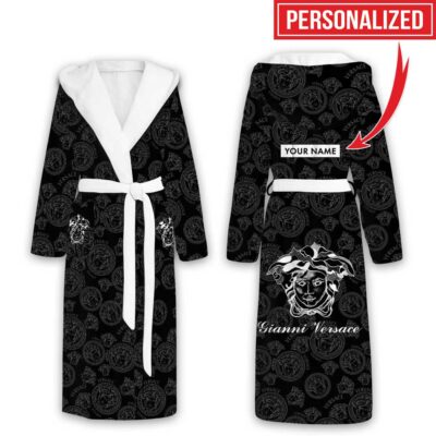 Versace Black Pattern Luxury Unisex Flannel Hooded Bathrobe