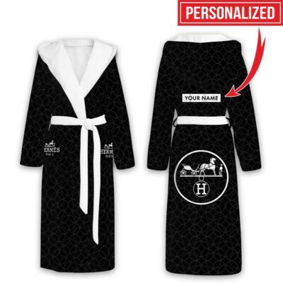 Hermes Black Circle Pattern Luxury Unisex Flannel Hooded Bathrobe
