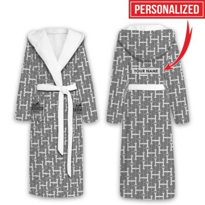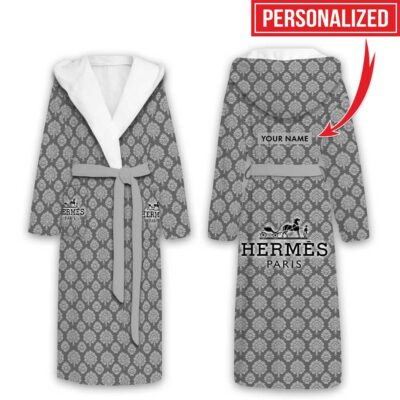 Hermes Silver H Pattern Luxury Unisex Flannel Hooded Bathrobe