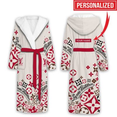 Louis Vuitton Red Pattern Luxury Unisex Flannel Hooded Bathrobe