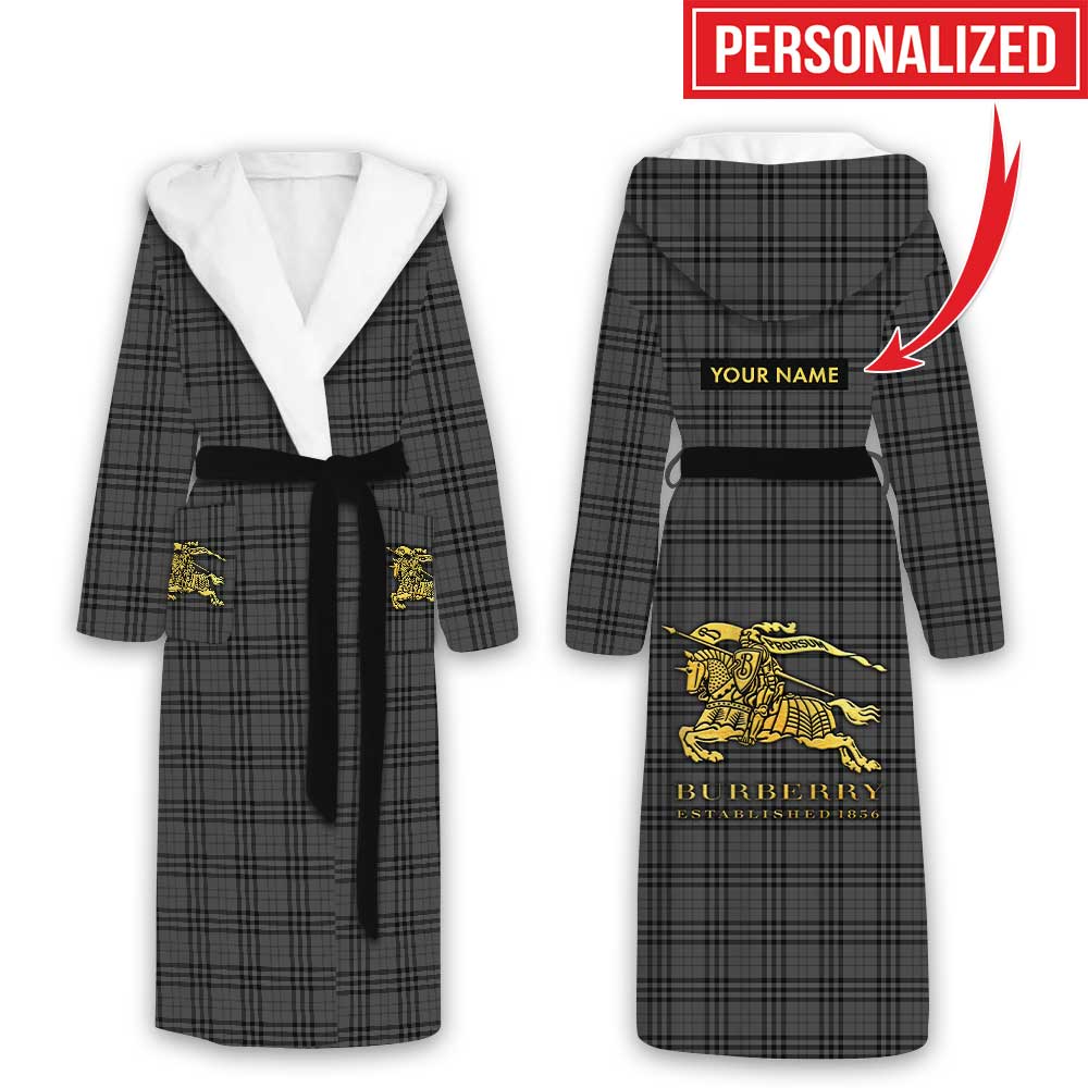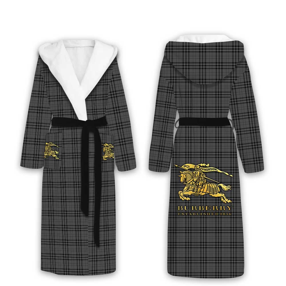 Burberry Gold Logo Grey Pattern Luxury Unisex Flannel Hooded Bathrobe