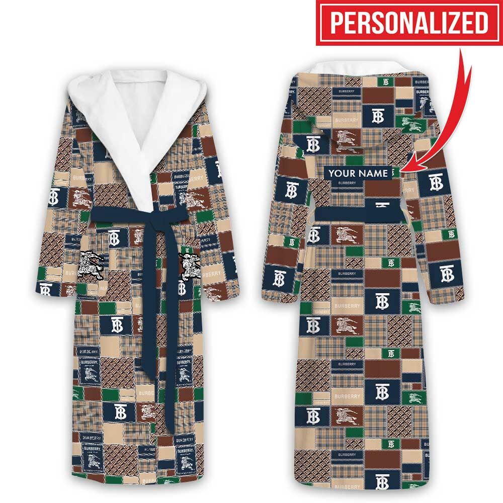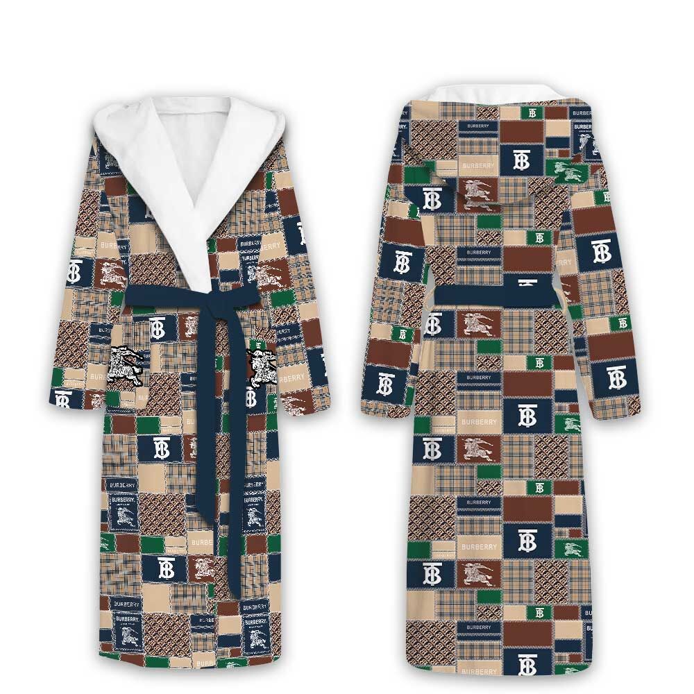 Burberry Logo Blue Green Pattern Luxury Unisex Flannel Hooded Bathrobe
