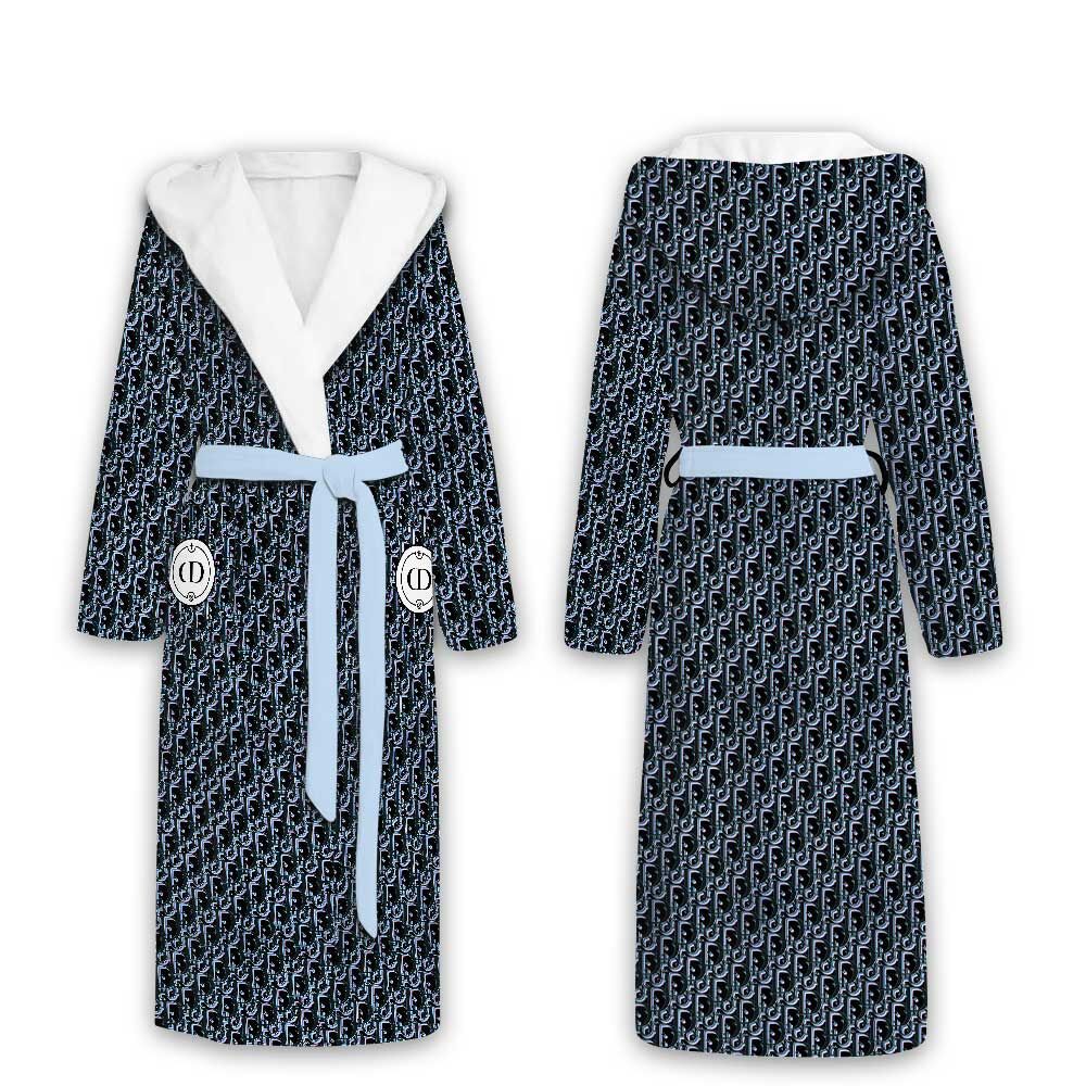 Dior Dark Blue Pattern Luxury Unisex Flannel Hooded Bathrobe