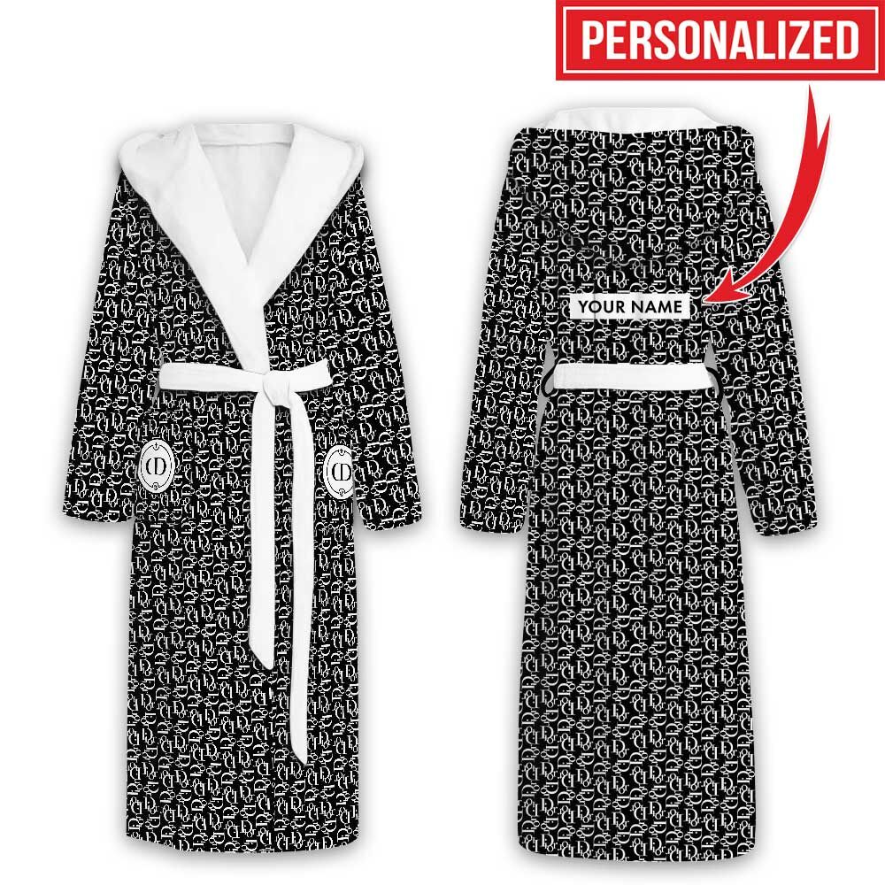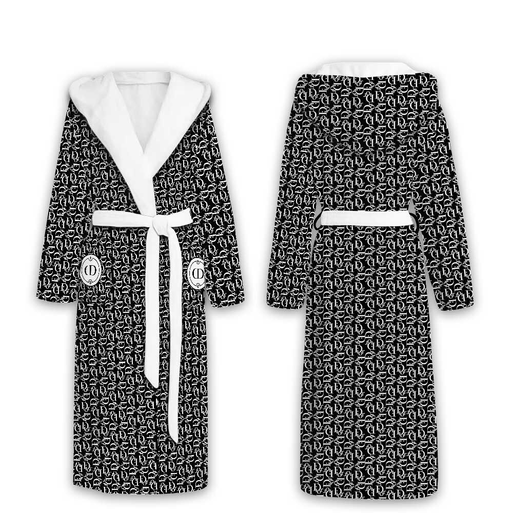 Dior Logo Black White Pattern Luxury Unisex Flannel Hooded Bathrobe
