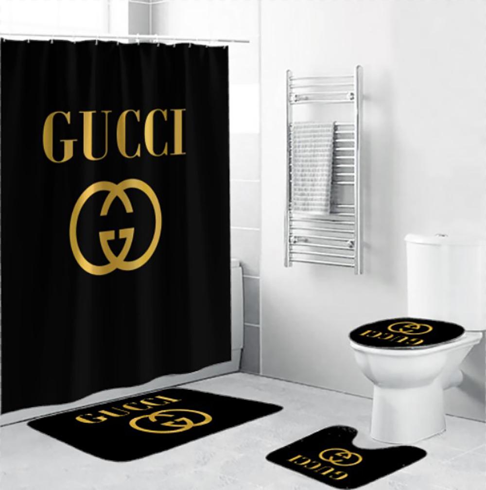 Gucci Luxury Bathroom Set Black And Gold Logo Shower Curtain BRS260