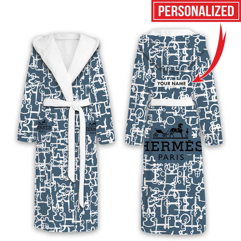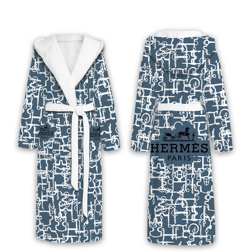 Hermes Blue Circle Pattern Luxury Unisex Flannel Hooded Bathrobe