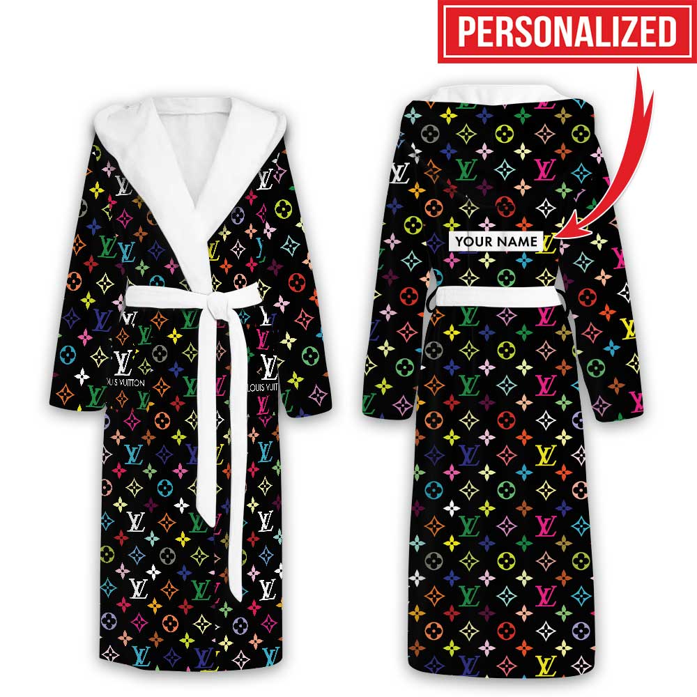 Louis Vuitton Black Colorful Pattern Luxury Unisex Flannel Hooded Bathrobe