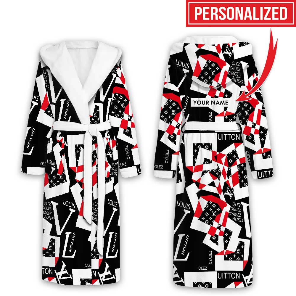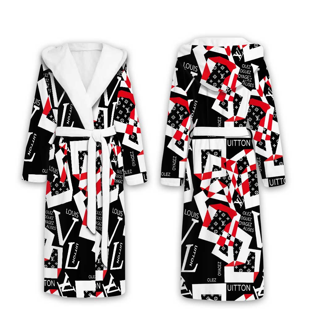 Louis Vuitton Black White Red Pattern Luxury Unisex Flannel Hooded Bathrobe
