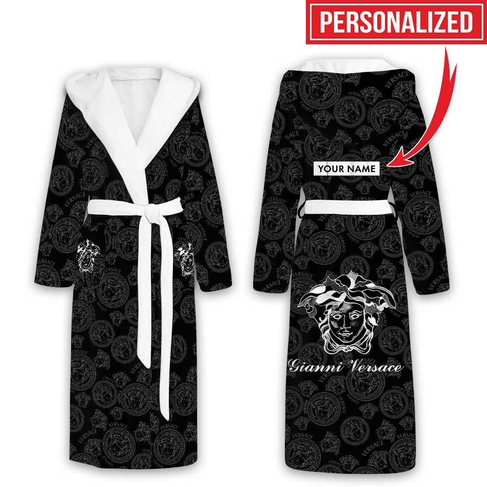 Versace Logo Pattern Luxury Unisex Flannel Hooded Bathrobe