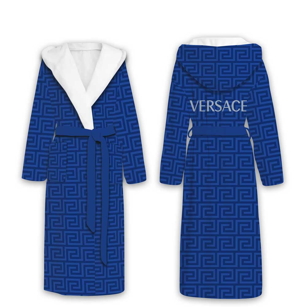 Versace Monogram Greek Key Deep Royal Blue Luxury Hooded Bathrobe Collection For Winter