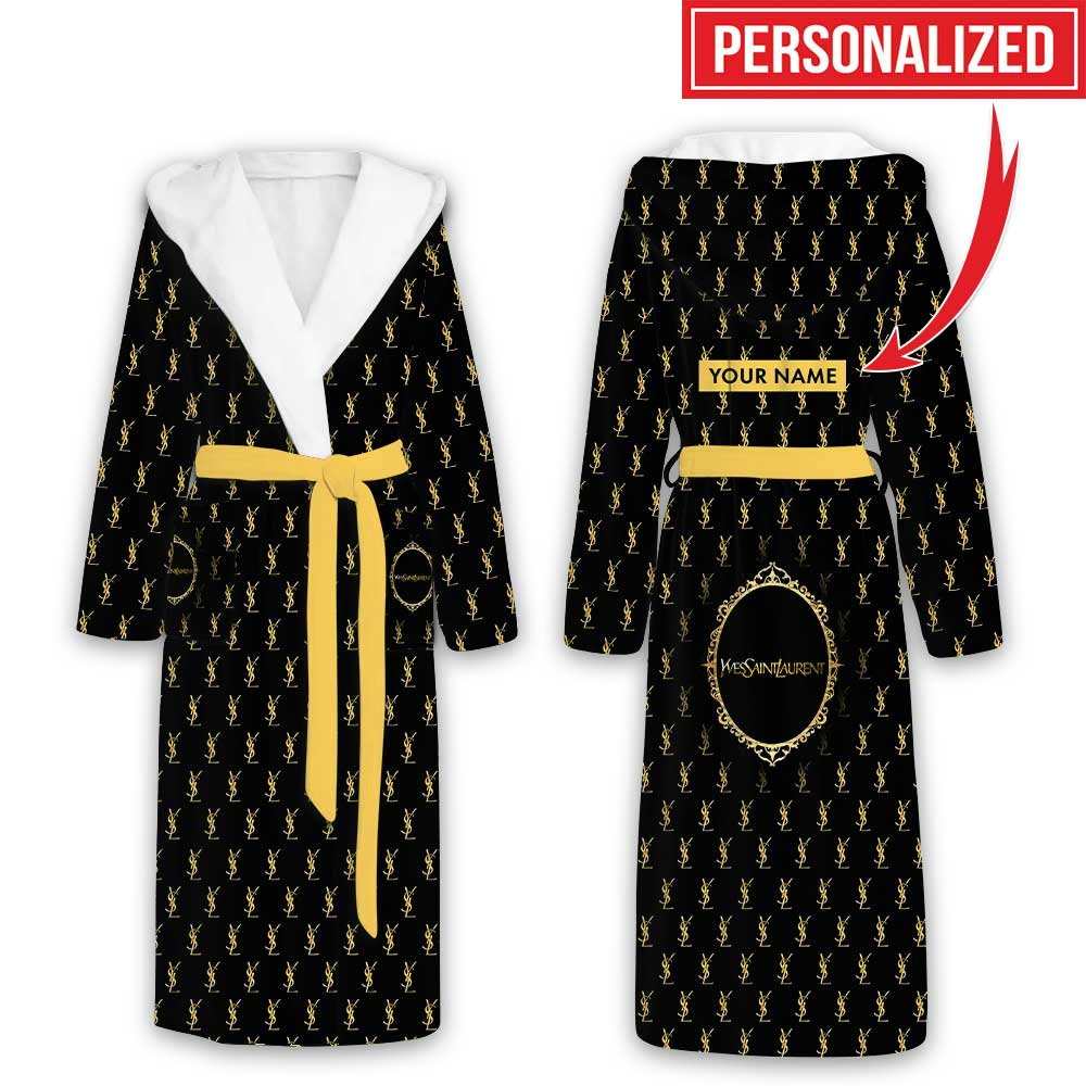 Yves Saint Laurent Gold Logo Pattern Luxury Unisex Flannel Hooded Bathrobe